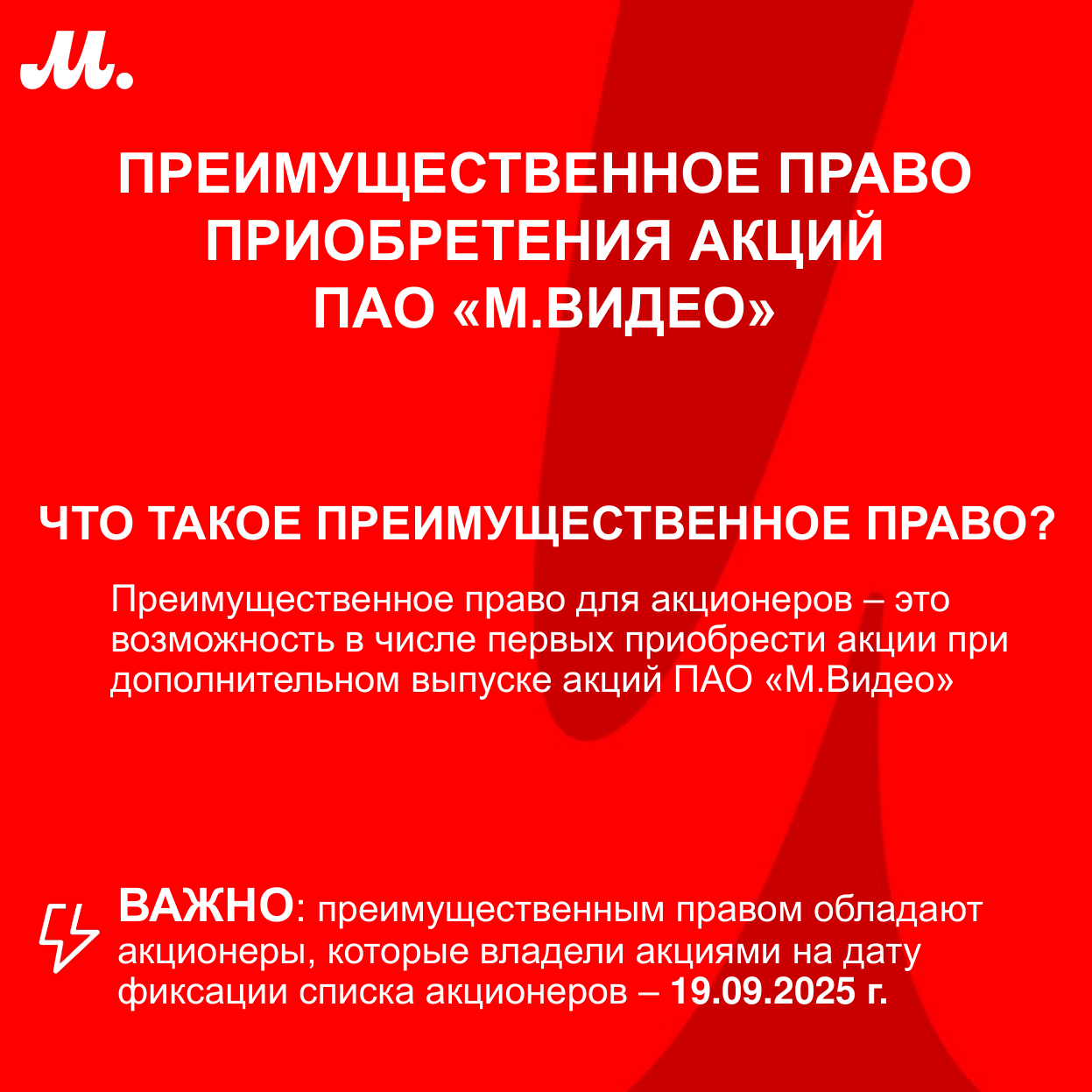 ПАО «М.видео», ведущая российская компания в сфере электронной коммерции и розничной торговли электроникой и бытовой техникой (МосБиржа: MVID), уведомляет действующих на 19 сентября 2025 года акционеров Компании о том, что начиная с 25 марта 2026 года у них есть возможность реализовать преимущественное право приобретения акций ПАО «М.видео» в рамках реализации дополнительной эмиссии по открытой подписке. Привлеченные средства от допэмиссии будут направлены на развитие ключевых направлений бизнеса Компании, включая реализацию новой стратегии по построению мультикатегорийного маркетплейса с развитой офлайн-розницей. Допэмиссия также завершит процесс дофинансирования Компании в объеме 30 млрд рублей от действующих акционеров. Предельный объем допэмиссии – 1,5 млрд обыкновенных акций, реальный объем может составлять кратно меньшую цифру относительно максимального числа акций к размещению.