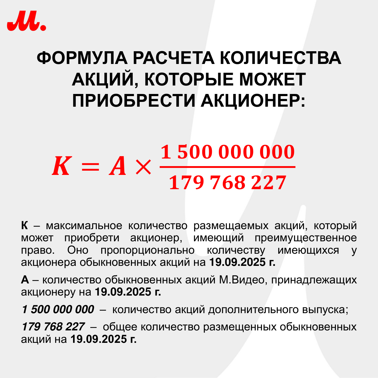 А – количество обыкновенных акций Эмитента, принадлежащих лицу, имеющему преимущественное право приобретения дополнительных Акций, на 19.09.2025 года – дату определения (фиксации) лиц, имеющих право на участие в общем собрании акционеров, на котором рассматривался вопрос «Об увеличении уставного капитала ПАО «М.видео» путем размещения дополнительных обыкновенных акций ПАО «М.видео» по открытой подписке»;